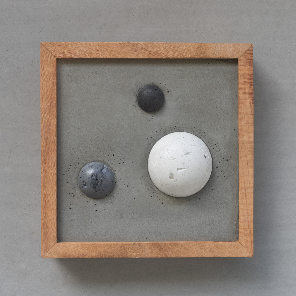 This unique work is one in a series of small framed works exploring form, colour, and material achieved through different layouts of 3 monochrome domes. Each work in this series is framed in Silky Oak with Gidgee and Red Cedar splines and measures 20 x 20 x 3.5 cm