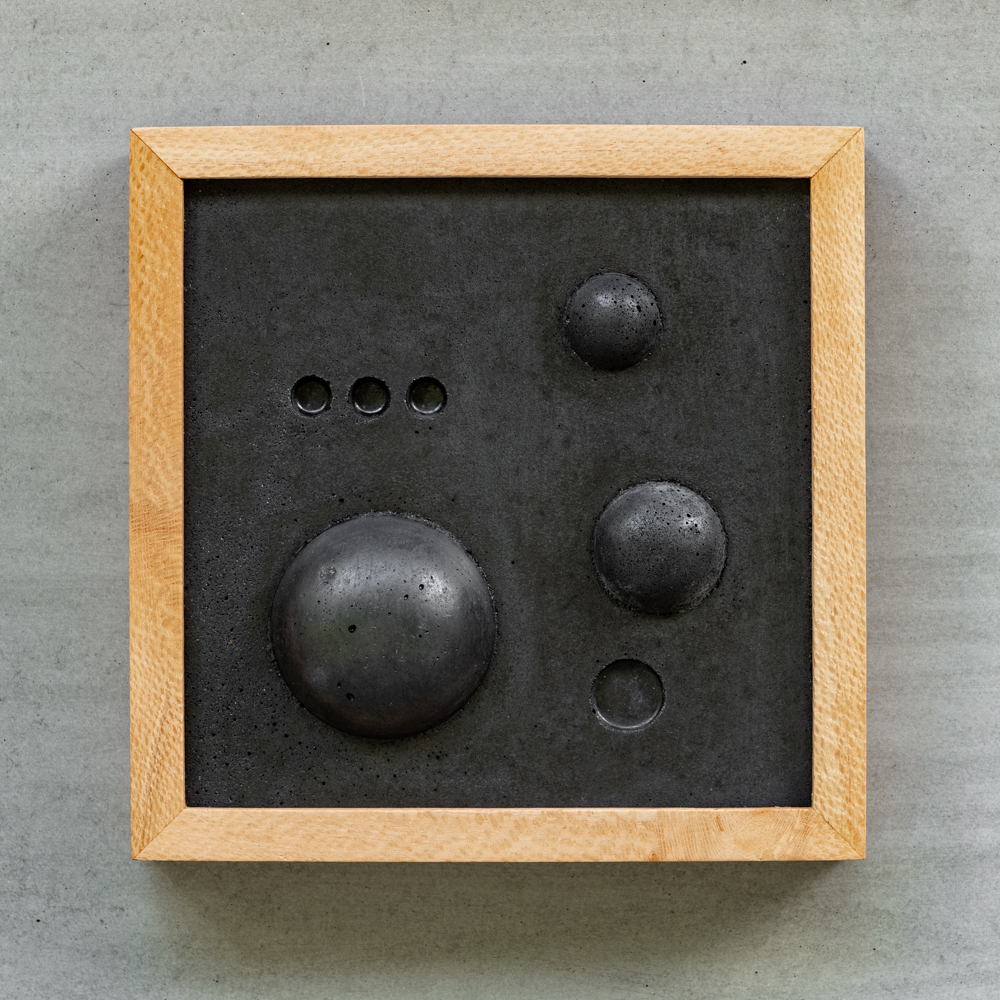 This unique work is one in a series of small framed works exploring form through the layout of the domes and circular impressions. Each work in this series is framed in Silky Oak with Gidgee and Red Cedar splines and measures 20 x 20 x 3.5 cm