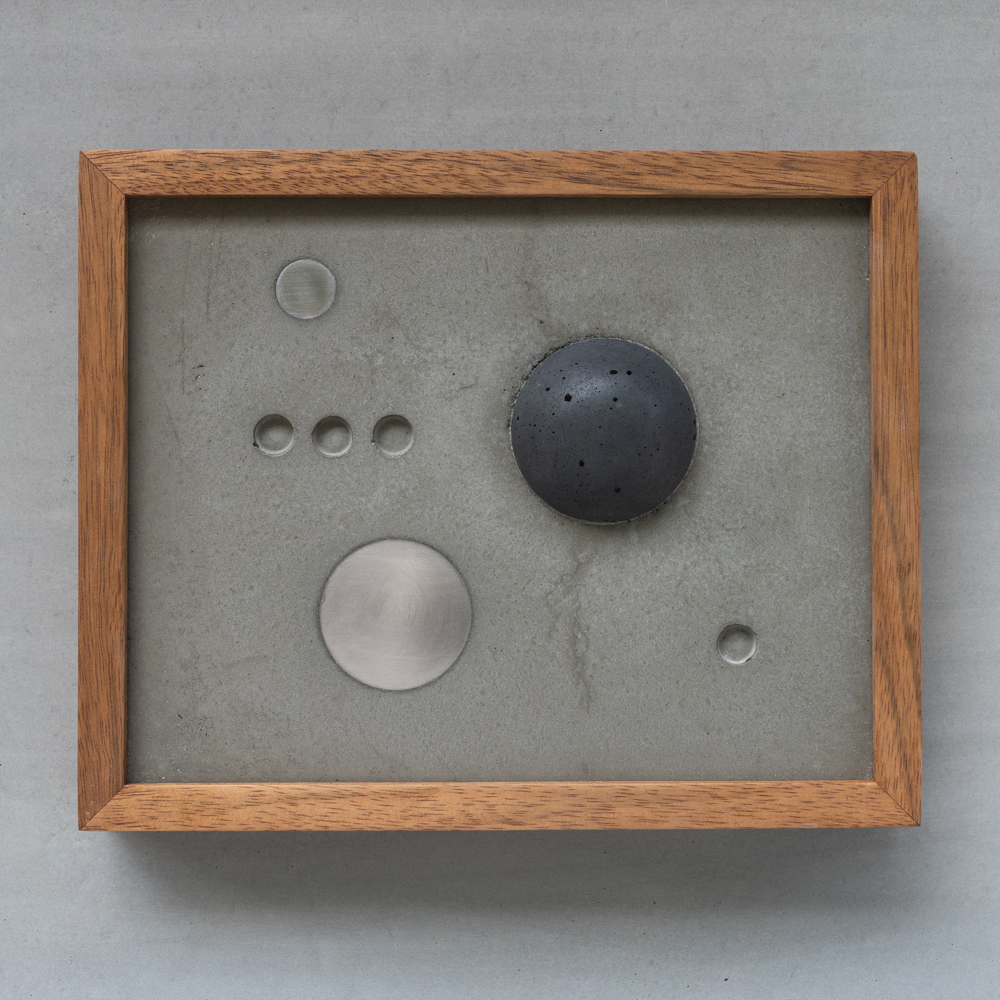 This distinctive concrete wall art piece includes stainless steel discs and circular impressions, meticulously framed in New Guinea Walnut, measuring 27.5 x 22 x 3.5 cm. Elevate your space with this carefully crafted masterpiece, effortlessly blending minimalist aesthetics with industrial allure.